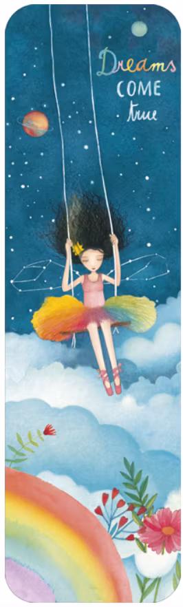 Ett bokmärke med underbara färger och ett härligt motiv. På bokmärket står texten "Dreams come true".
