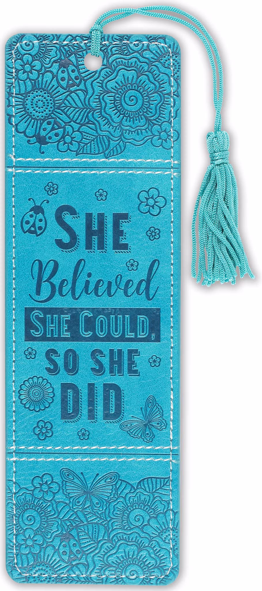 Bokmärket är gjort av konstläder och har en vacker, mörkturkos färg.