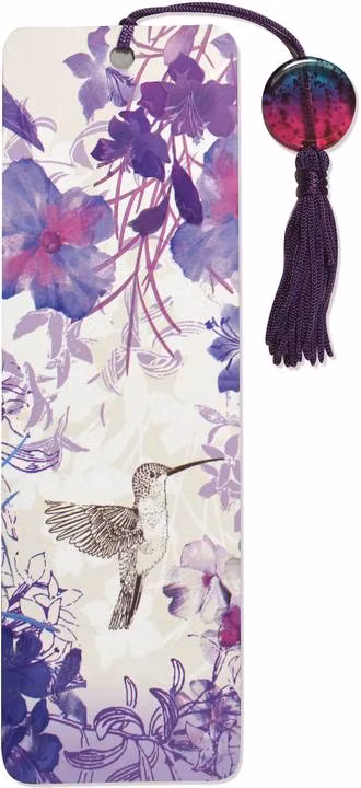 Hitta lätt och rätt till där du slutade läsa med ett riktigt fint bokmärke! Här är ett bokmärke med lila toner och en vacker kolibri.
