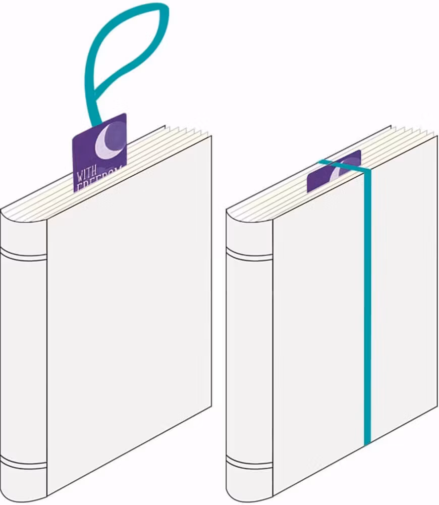 Bokmärket har ett gummiband med en ögla som du kan sätta runt boken, fäst vid sig.