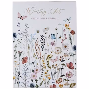 Förpackningen innehåller 20 brevpapper och 20 kuvert med blomstermotiv. Allt ligger i en vacker förpackning med matchande omslag.
