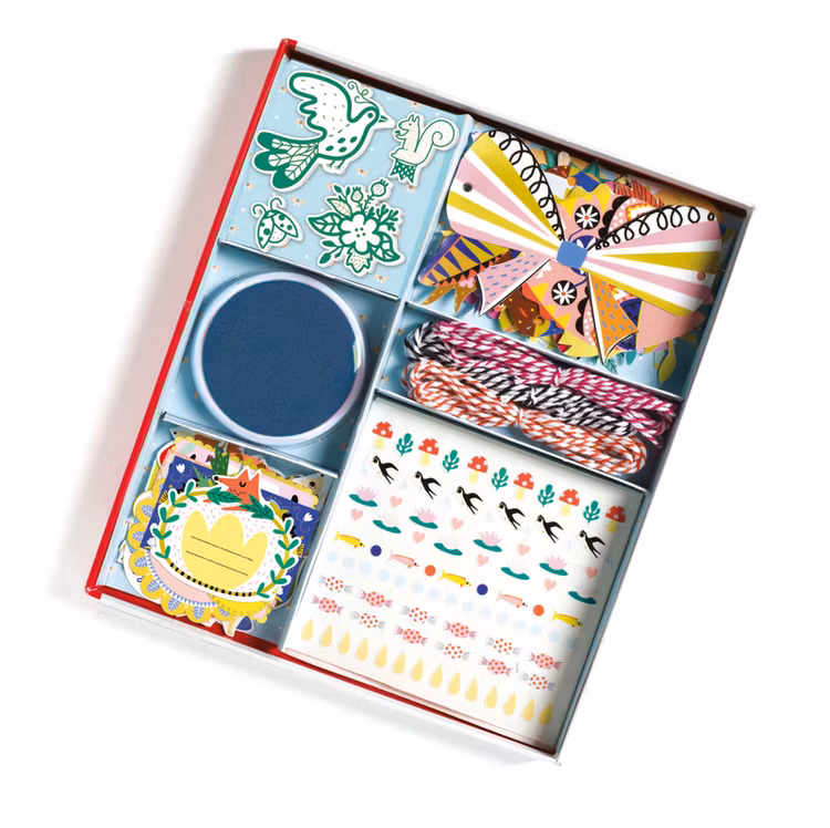 Underbart pyssel-kit att dyka ner i! Den välfyllda asken innehåller allt du behöver för att dekorera presenter, dagböcker, eller vad du nu kan tänka dig. Förpackningen innehåller tvåfärgade snören, kartongsiluetter, klistermärken, stämplar och mycket mer! Låt kreativiteten flöda, och gör dig själv eller någon annan glad med färg och form och flärd!