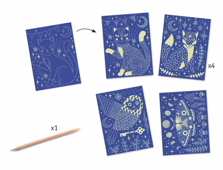 Skrapa på bilderna med hjälp av den medföljande skrappinnen. När du skapar på ytan kommer det som döljer sig under den grå ytan fram. Här kommer du få fram olika självlysande bilder. Motiven kommer från naturen. Det medföljer 4 olika kort att skrapa och en liten skrapa att skrapa fram de självlysande partierna med. Korten föreställer en uggla, en nattfjäril, en katt och en räv.