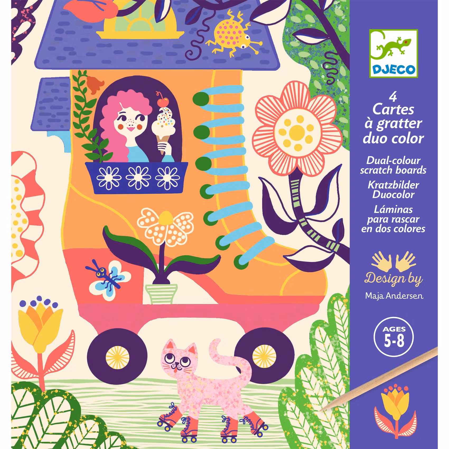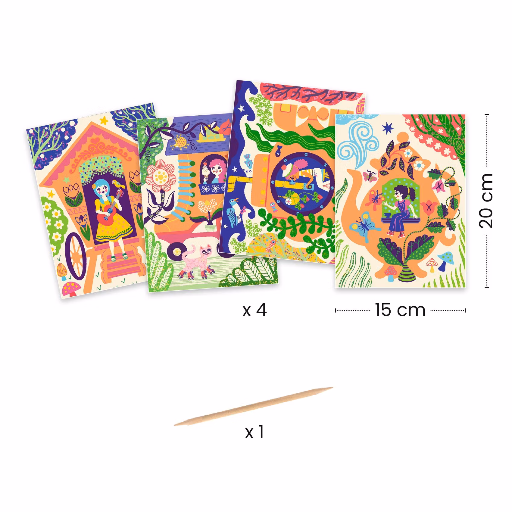 Ett set av fina skrapkort där du förstår konceptet "före och efter". När du skrapar får du se vad som gömmer sig i motivet. Här finns olika varianter av hus, som är lite mer ovanliga att bo i. Du återskapar mönstren designade av konstnären med hjälp av instruktionerna eller improviserar egna mönster som du skrapar in med hjälp av verktyget. Bit för bit avslöjas de vackra och färgglada illustrationerna som genom magi!
