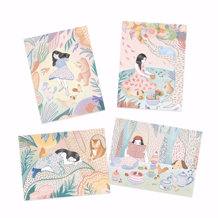 Skrapa fram härliga sommardagar i fina rosa och mintgröna motiv! Skrapa på bilderna med hjälp av den medföljande skrappinnen. När du skrapar på ytan kommer det som döljer sig under ytan fram. Korten föreställer en picknick, en tupplur i grönskan, dans med skogens konung (björnen), och ett dignande bord med läckerheter. Förpackningen innehåller 4 olika motiv och en skrappinne.