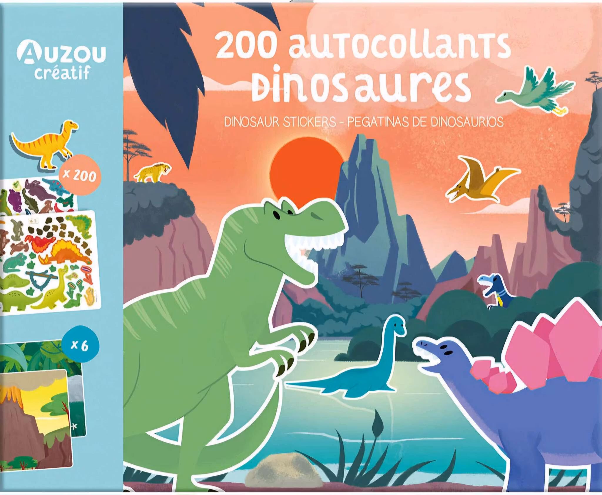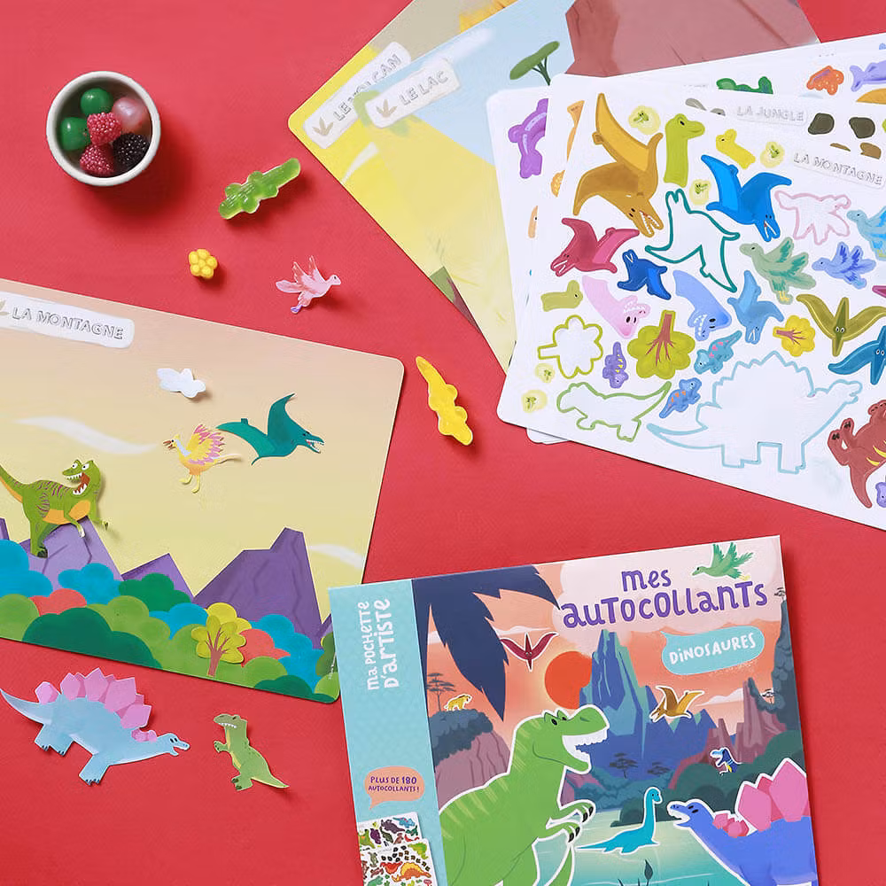Här finns också 6 vackra bakgrundsscener som med lite fantasi kan ge liv till alla klistermärkena. Vad gör dinosaurierna på dagarna och var sover de på nätterna?