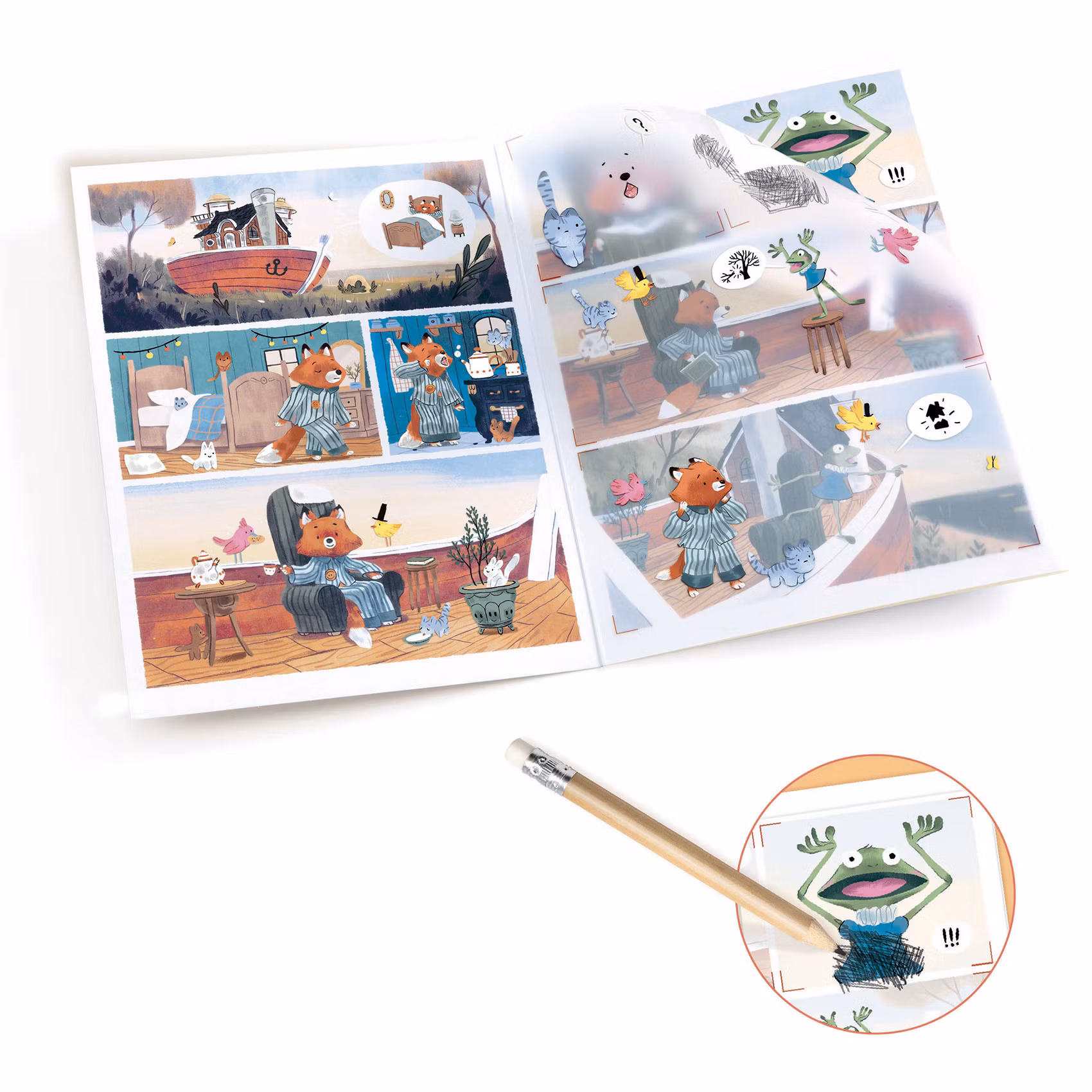 Ett kul set där du kan sätta ihop en tecknad serie med hjälp av gnuggisar som du placerar där du vill på den illustrerade bakgrunden. Bakgrunden är indelad i rutor som en riktig serietidning. Du överför bilderna genom att gnugga en penna över dem.