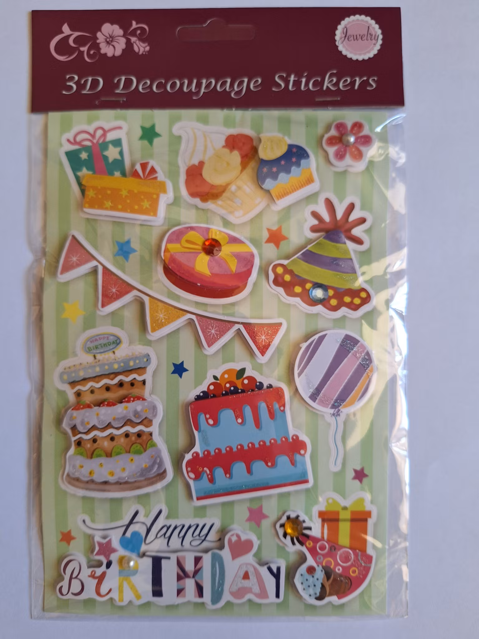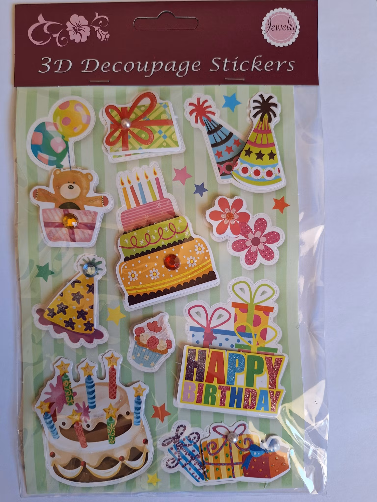 Här finns många olika små ark med klistermärken. Alla med fina kalasmotiv. Klistermärkena har papperslager i flera nivåer vilket gör att en 3D-effekt uppstår och klistermärkena blir mycket mer levande. Klistermärken har glitter och vissa har även en pärla eller diamant för att göra dem extra fina.