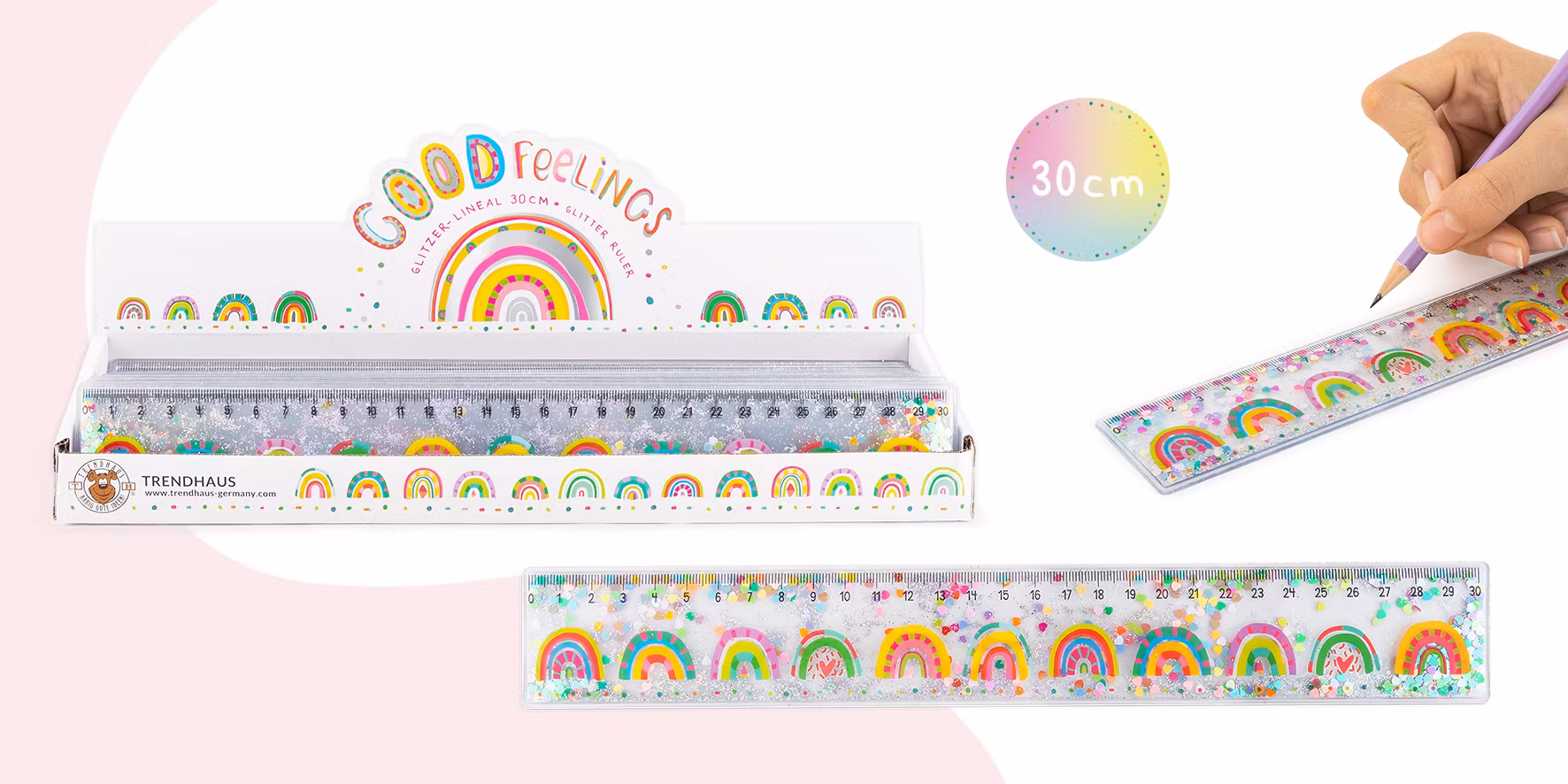 Här finns det en härligt glittrig 30 cm lång linjal som kan förgylla din dag. Linjalen är transparent och böjbar. Den är dekorerad med små färgglada regnbågar.
