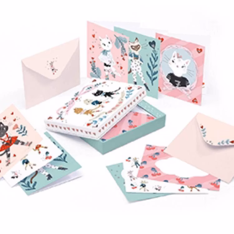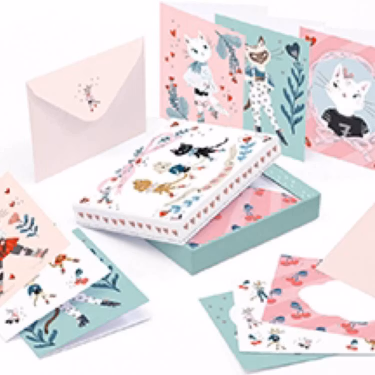 Fint set med kort och kuvert med metallic-effekter, även den fina förvaringsboxen har metallic-effekter. Förpackningen innehåller 10 kort och 10 kuvert i fem olika designs. Kortens storlek: 9 x 11 cm, kuvert: 11,5 x 9,2 cm.