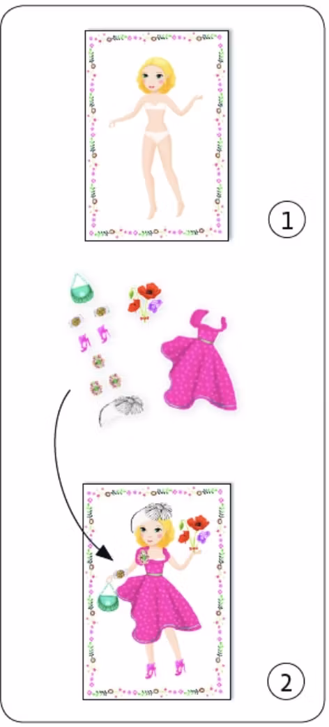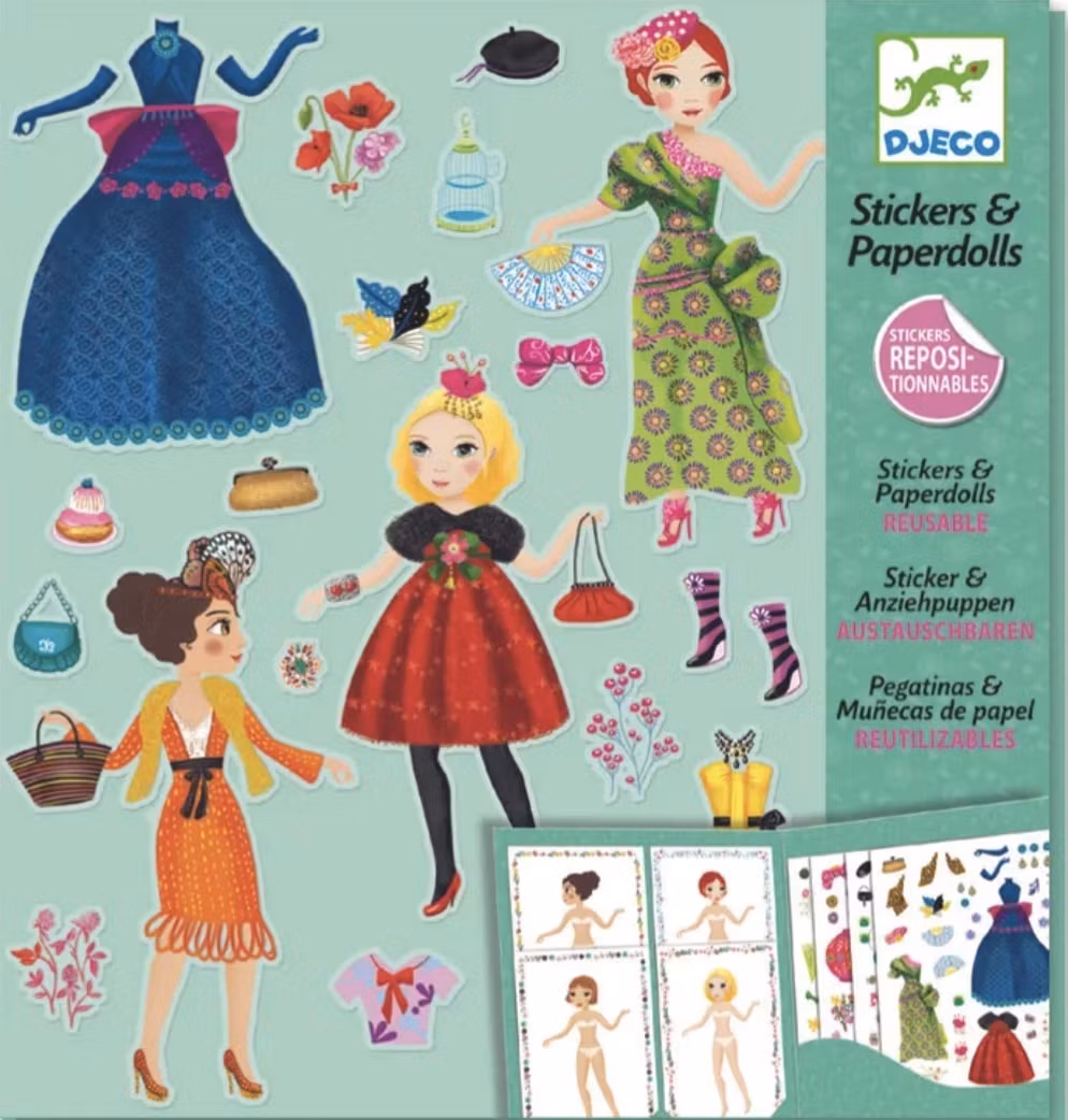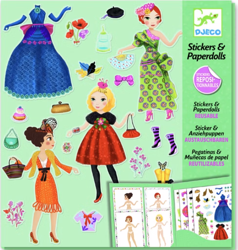 Ett roligt set med 4 olika tjejer att klä upp. En modern form av klippdocka där du har 8 kort (9,5 x 14 cm) med bilder på olika tjejer och en hel bunt med olika självhäftande kläder och accessoarer som du kan flytta på och använda om och om igen. Du får också en stadig mapp med fack att förvara alla delar i - en mycket portabel sysselsättning.