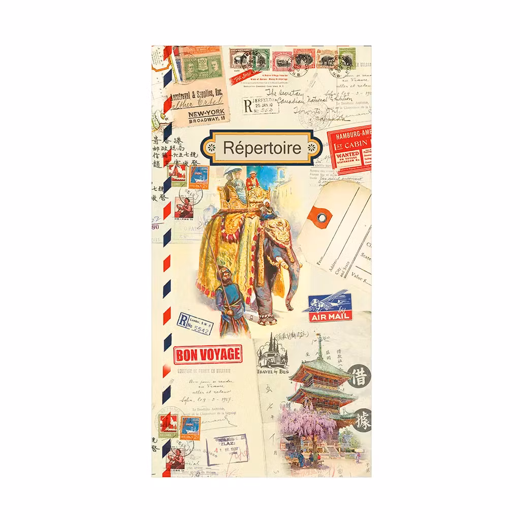 En mycket vacker, avlång adressbok med illustrationer av resor. Bokens alfabet går från A-Z.Här finns plats för namn, adress, hemtelefon, mobiltelefon m.m.
