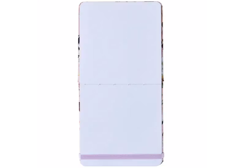 Blockets har 192 blad och är ca 11x11 cm. Blocket stängs med ett fint gummiband och är perfekt för att rymmas i väskan.