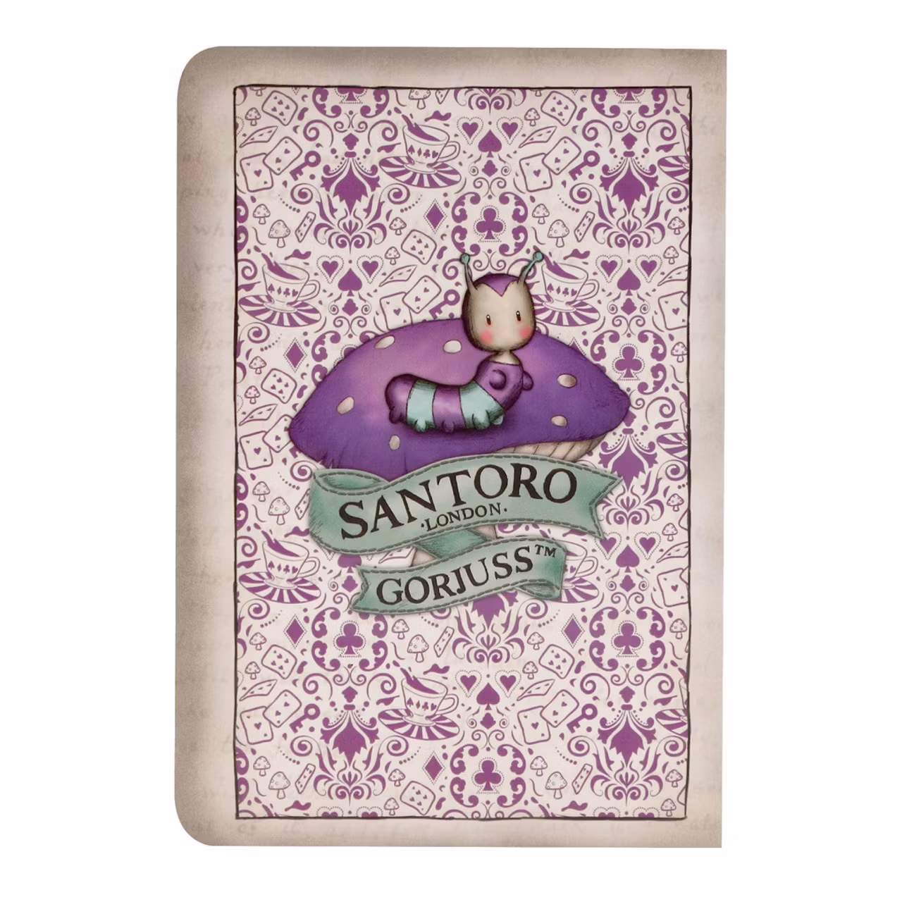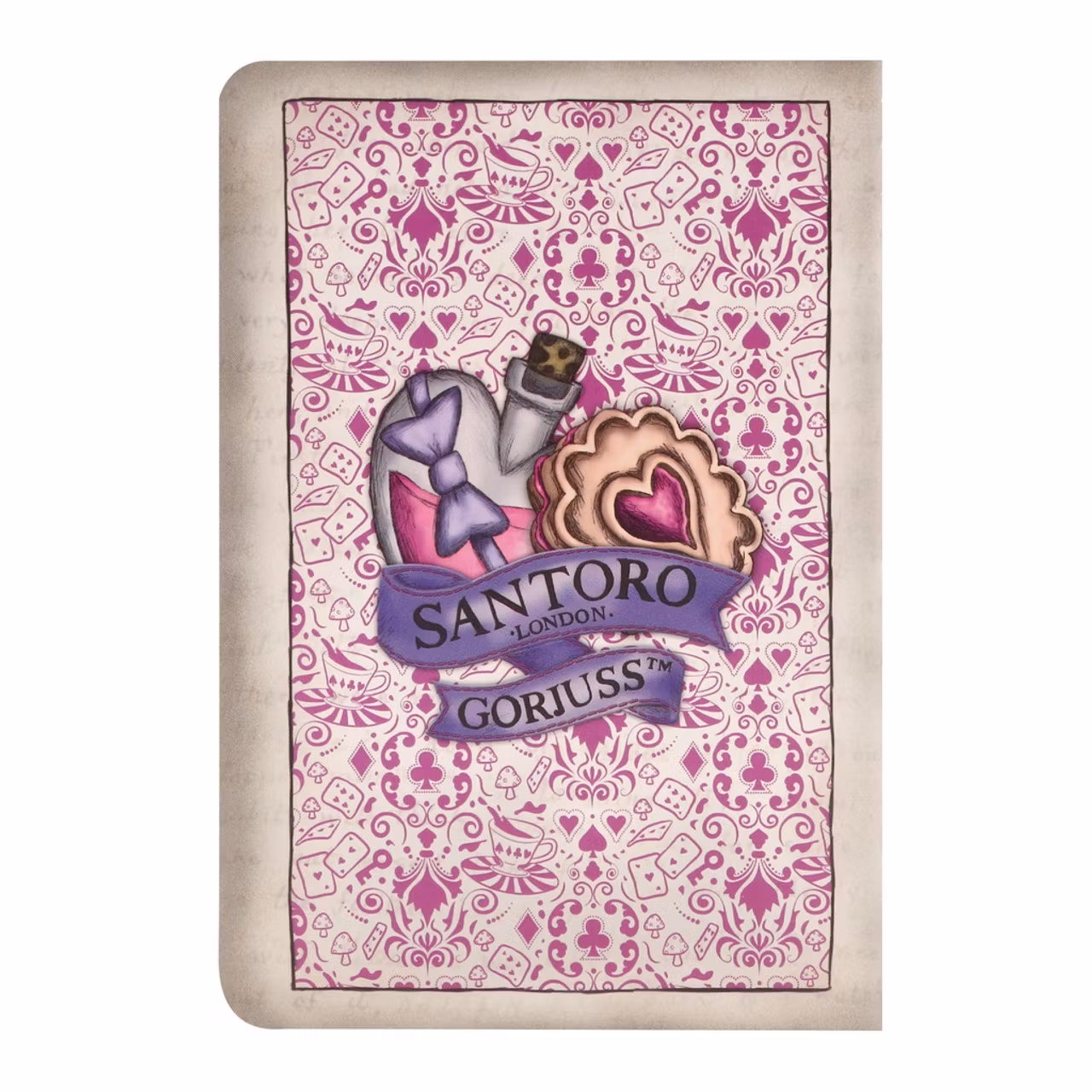 Här finns fyra små underbara anteckningsböcker i en förpackning omknuten med ett vackert sidenband. Alla böckerna har motiv med inspiration från Alice i Underlandet.