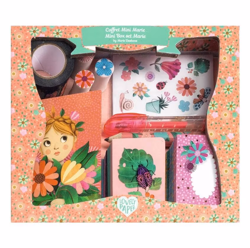 En underbar låda med allt som behövs för att pyssla ihop vykort med blommor och trädgårdens insekter som teman. Många av dem har skimrande med metallglänsande detaljer. Det blir så roligt att skriva hälsningar till nära och kära när man har vackra små kort, små klistermärken och mönstrad papperstejp att dekorera med. Allt kommer samlat i en fin ask som gör det lätt att hålla reda på allt.
