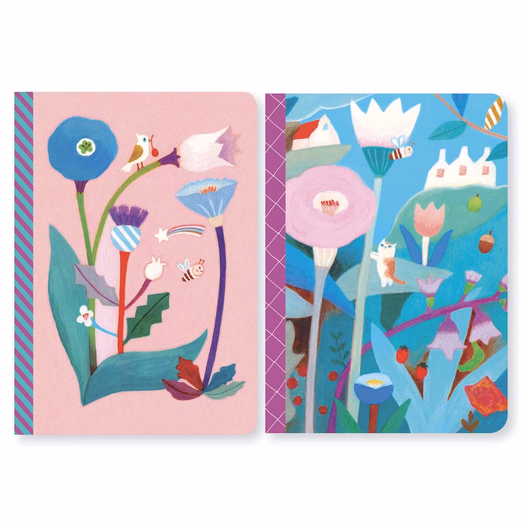 Anteckningsböcker i två-pack med snygga illustrationer i form av målade blommor med vattenfärgskänsla på omslagen och rosa samt blå bakgrunder.