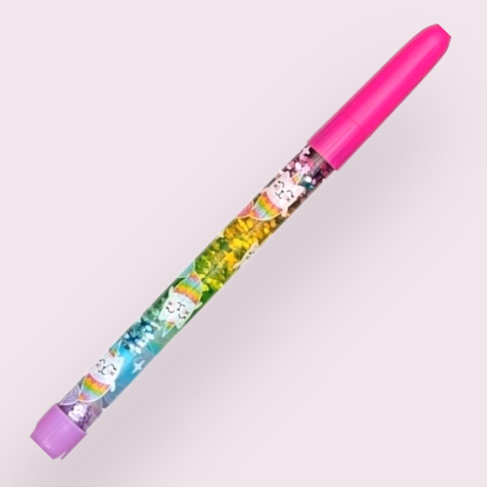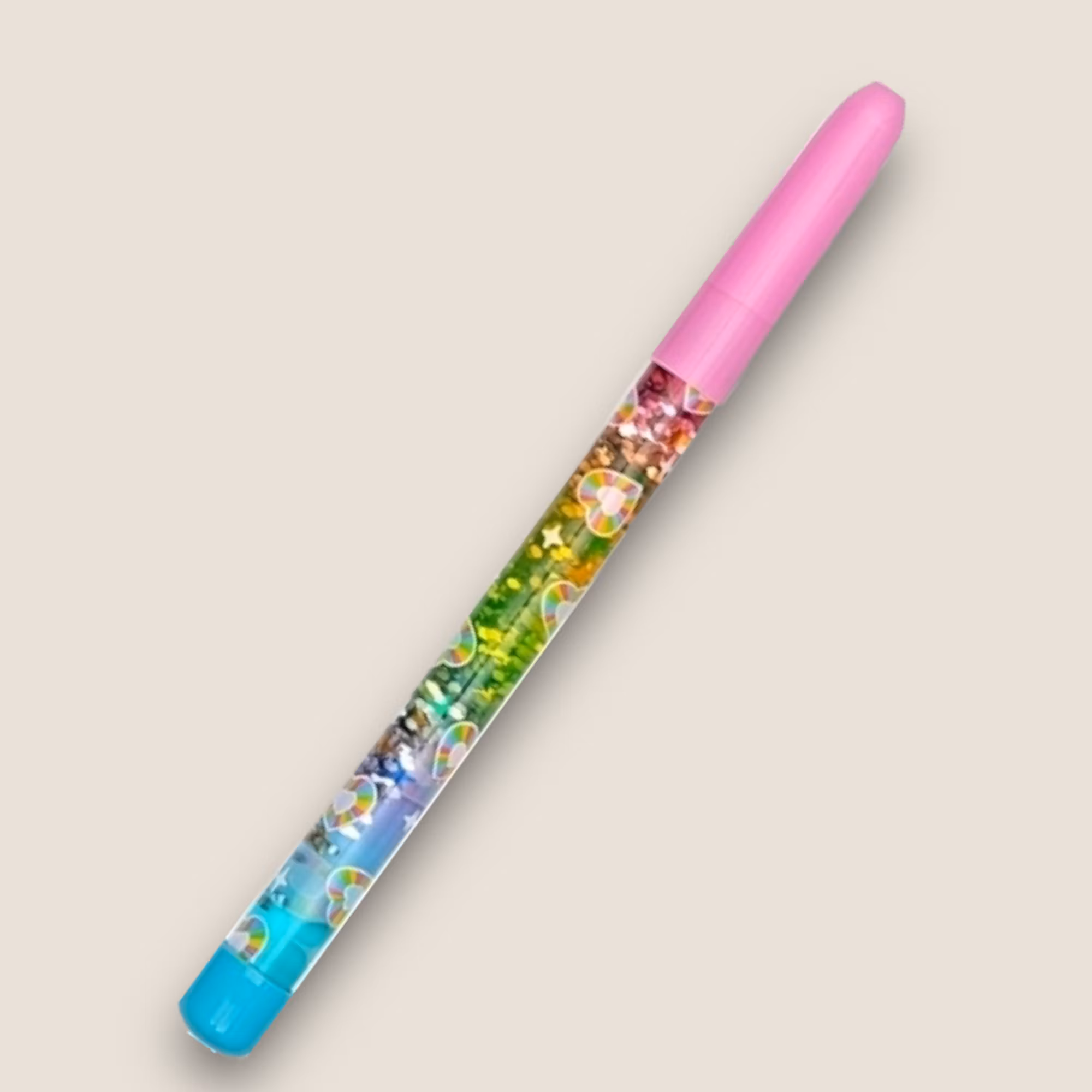 En härlig penna med en glitterstav. Glittra dig igenom ditt skrivande Pennorna har svart bläck. När du skakar staven virvlar glittret runt.
