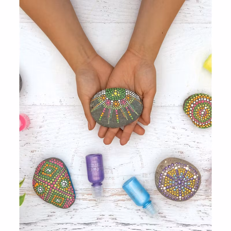 Med Dot-A-Lot-färgerna kan du klämma ut färg ur de små flaskorna och göra dekorationer på de nästan alla material. Dot-A-Lot-färgerna kan användas på t.ex. papper, trä, keramik, glas, sten och snäckskal.