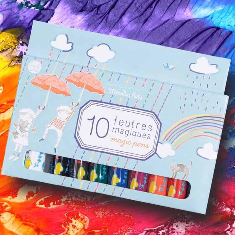 Rita som vanligt med de färgade pennorna och använd sedan den genomskinliga pennan ovanpå - då ändrar färgpennan färg!