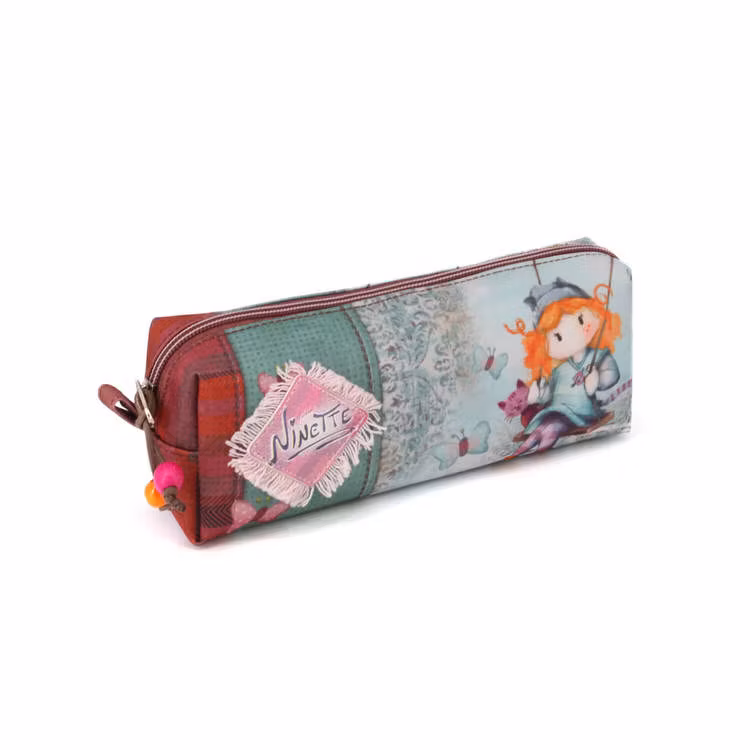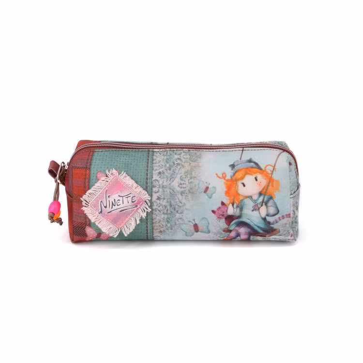 Ett mycket rart pennskrin i mjukt material med ett stort fack. Pennskrinet har fina illustrationer av en flicka och en katt som gungar tillsammans. Enkelt och behändigt för praktisk förvaring av pennor, kritor och sudd, Det sitter fast en fin bjällra i pennskrinet. Om du inte vill ha bjällran där kan du haka av den och hänga den på t.ex. din väska istället. Pennskrinet går lätt att öppna med dragkedja.