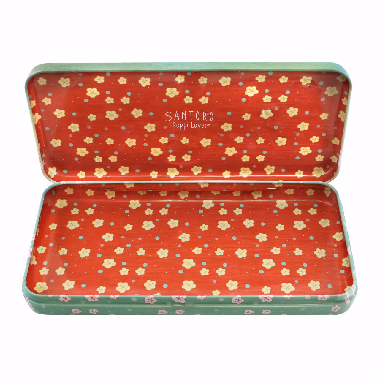 Underbart pennskrin med motiv från Poppi och den vita kaninen. Här ser du dem bland en massa blommor och böcker. Insidan av pennskrinet är fullt av blommor.