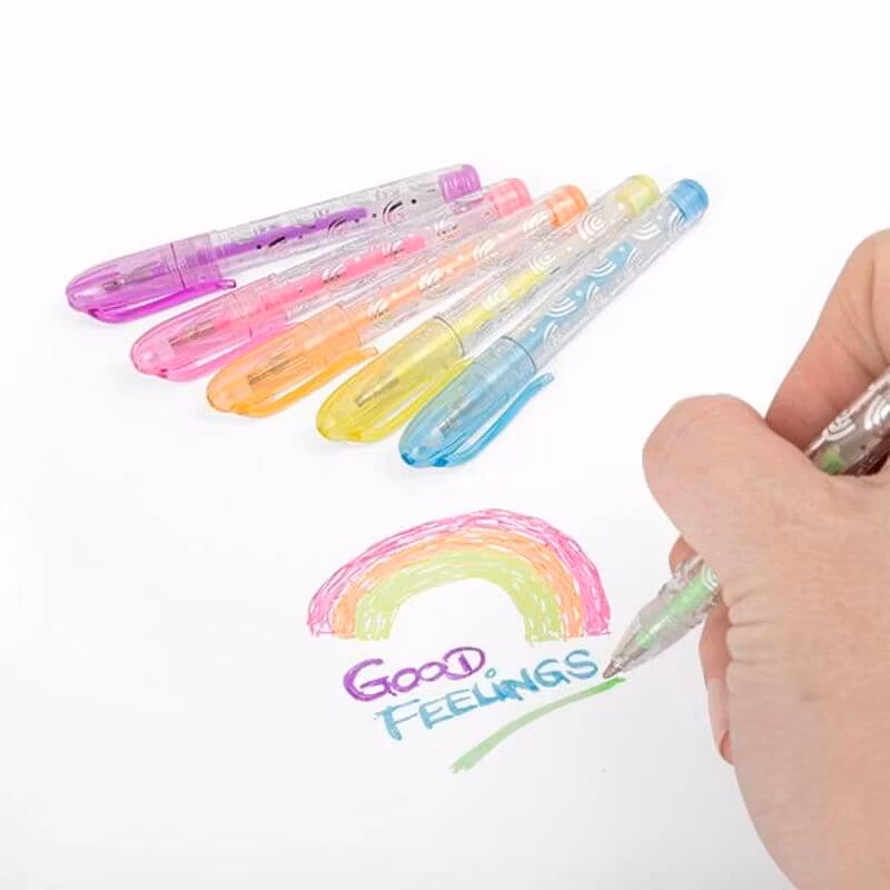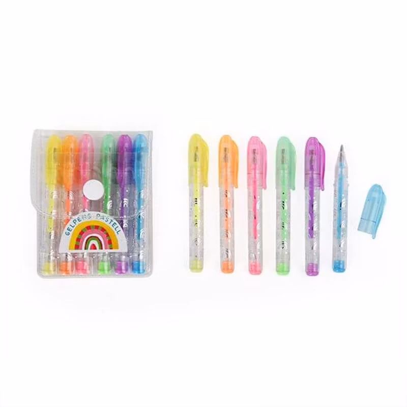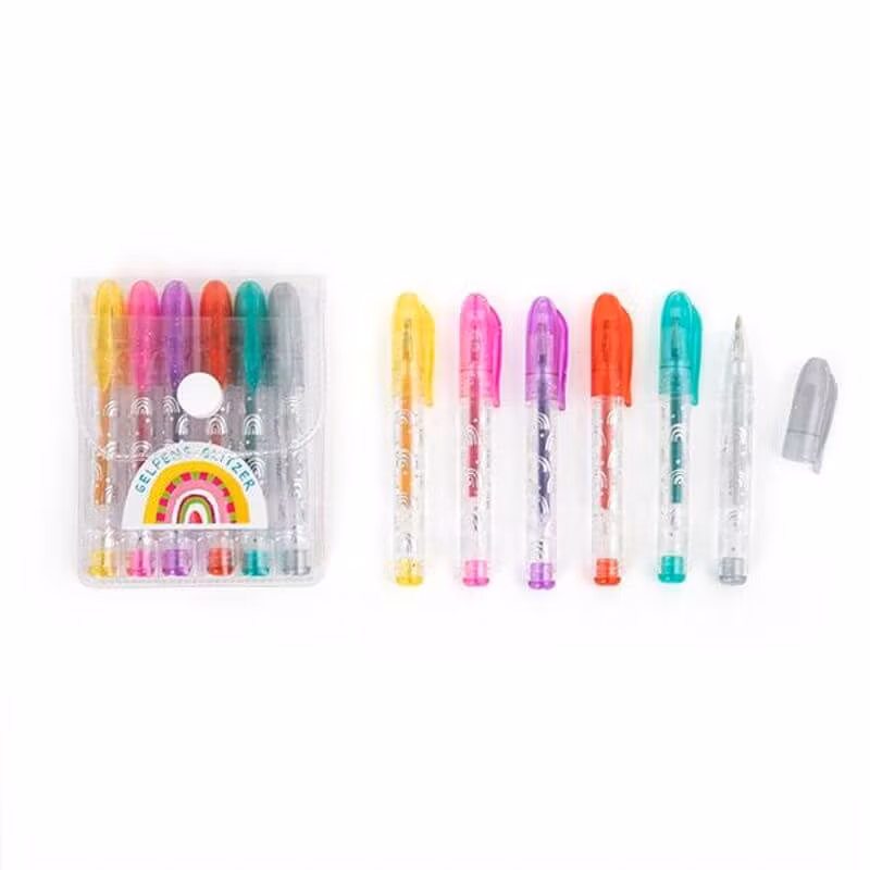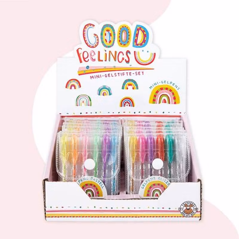 Fina mini gelépennor i fodral med tryckknapp. Två olika uppsättningar färger finns: pastell (gul, orange, ljusrosa, mintgrön, lila och ljusblå) samt glitterfärger (guldgul, rosa, lila, röd, blågrön och silver). Innehåller 6 olika färger som du kan använda för att skissa, rita, färglägga och skriva. Perfekt att ha med sig. Alla pennorna har en tryckt design med silverfärgade regnbågar.