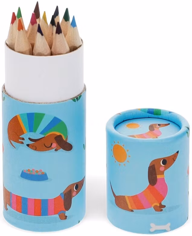 Här finns 12 fina pennor i en liten tub med med illustrerade taxar. Pennorna har olika färger och är av blyertsmodell.