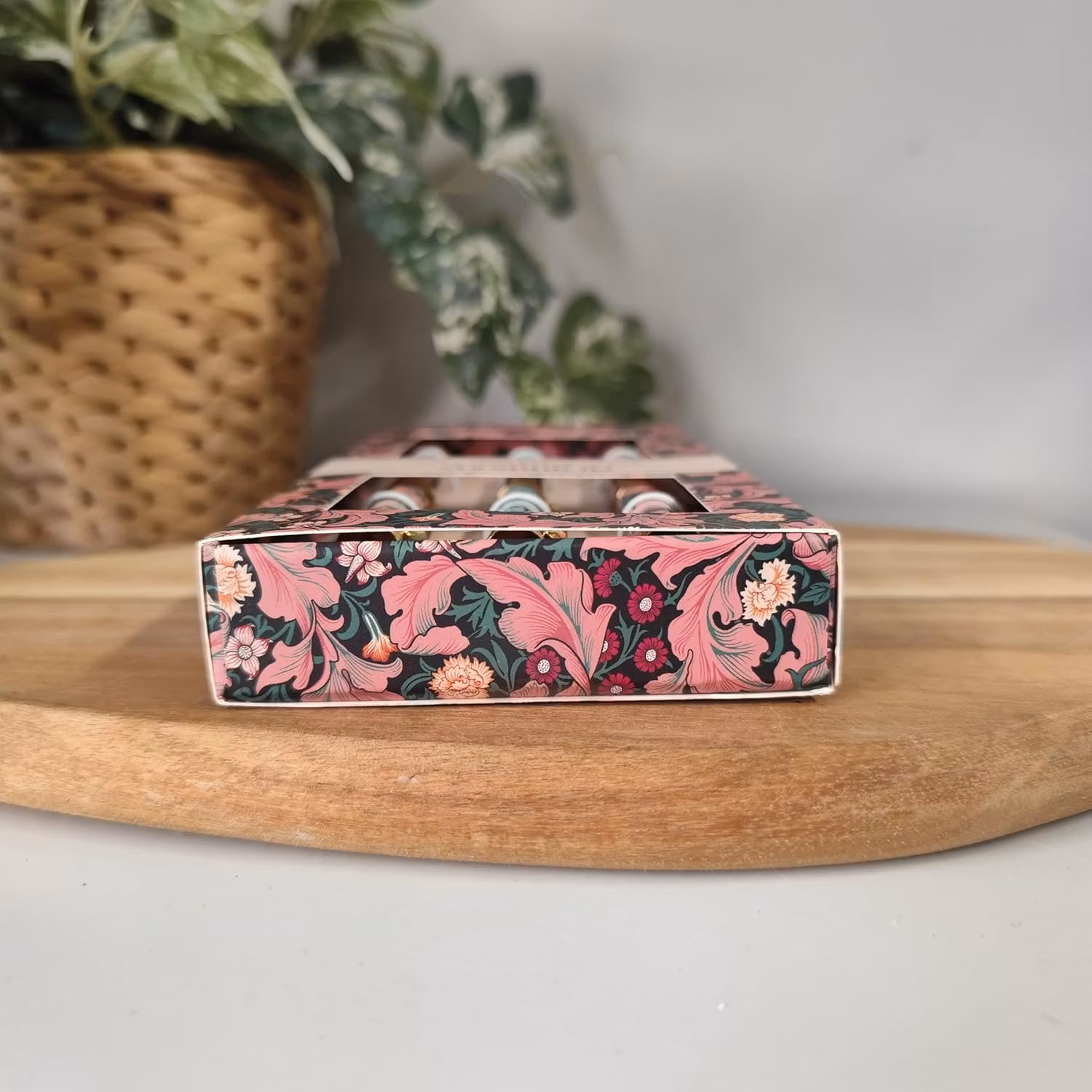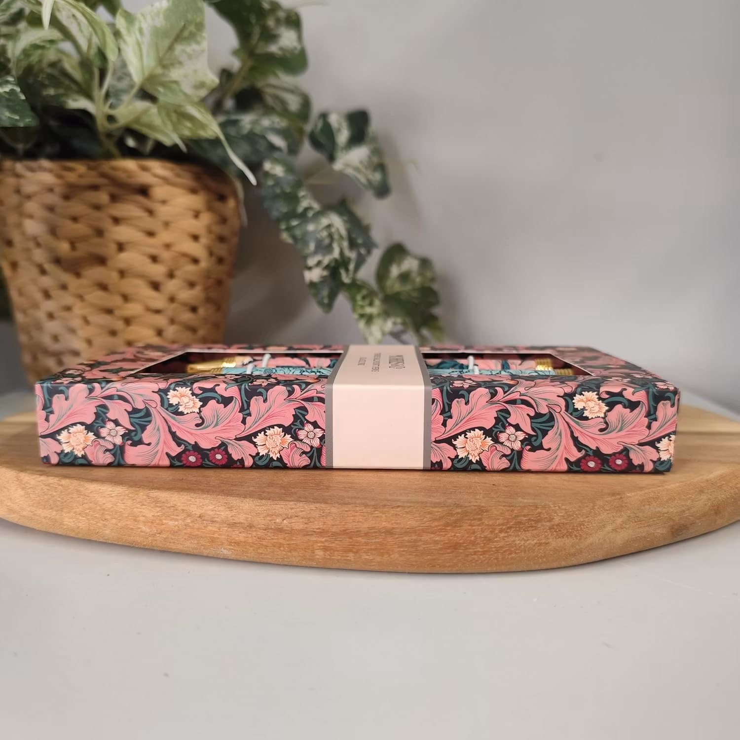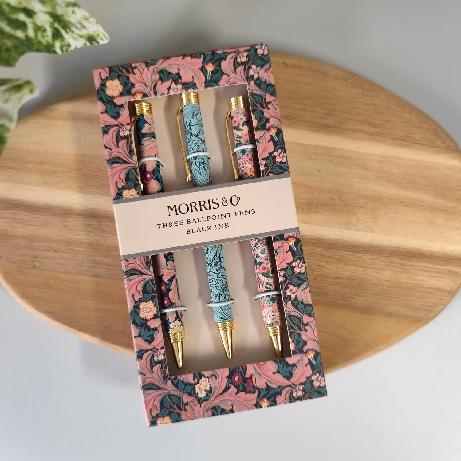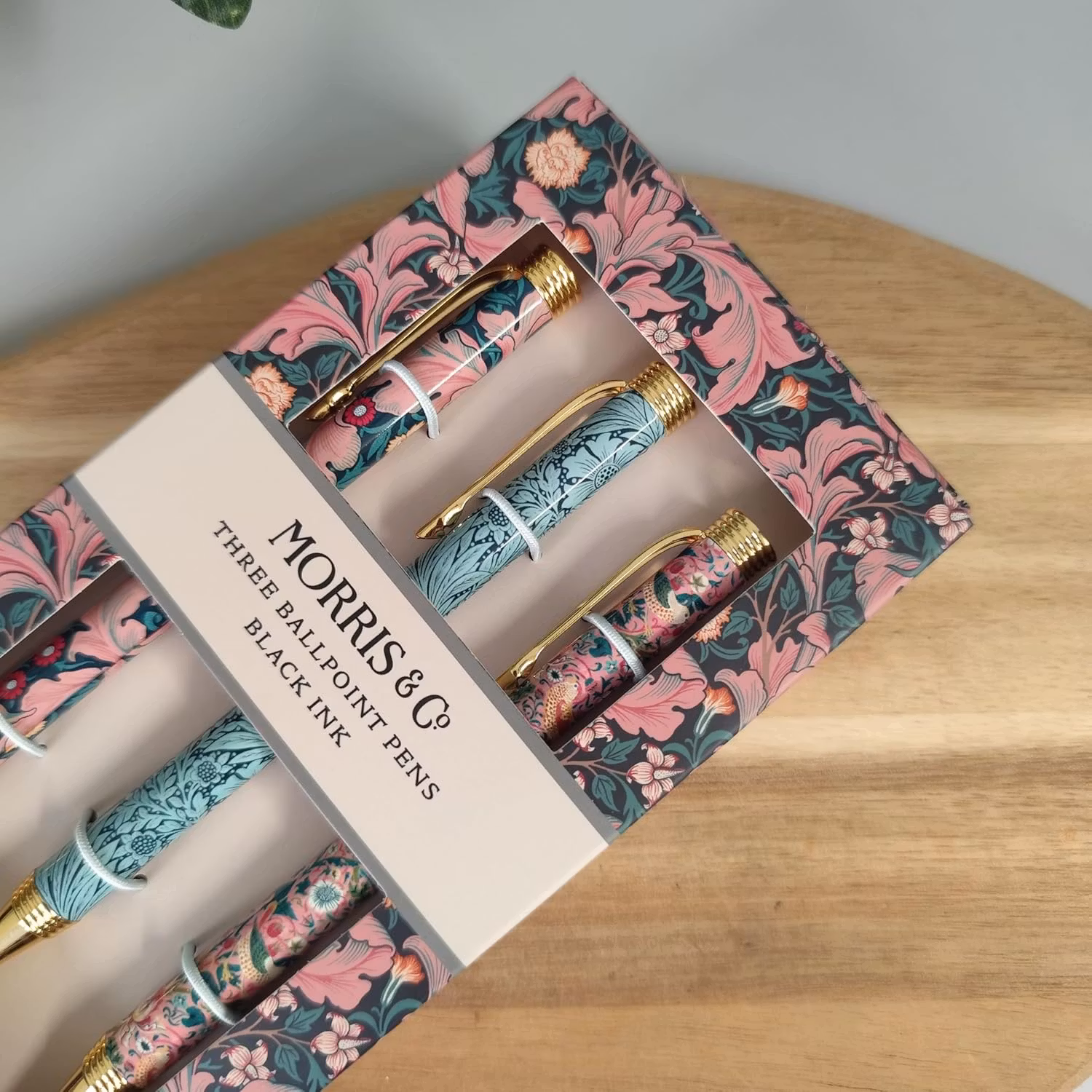 Här finns ett vackert set med tre kulspetspennor med svart bläck och med olika motiv. Designen är signerad William Morris.