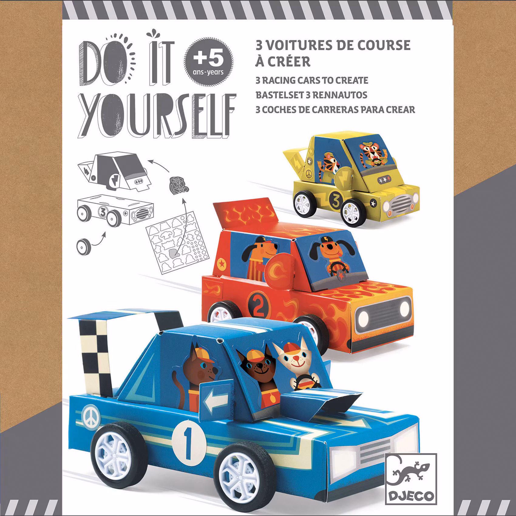 Ett häftigt set med pyssel där du får vika, sätta ihop och dekorera tre olika racing bilar och två olika flaggor som du sedan kan leka med.