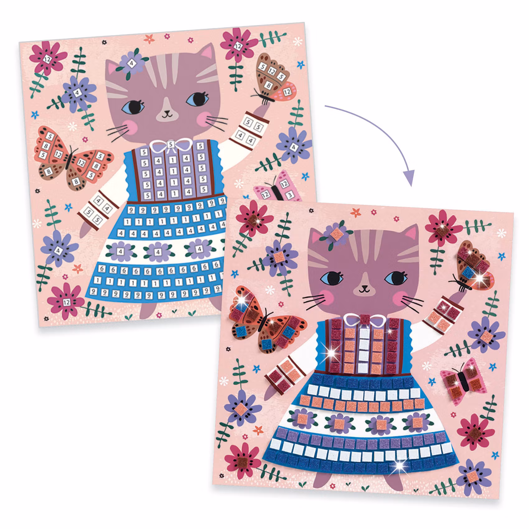 Ett roligt set med mosaikpyssel där du får dekorera de vackra klänningarna till fyra olika gulliga djur med glittrande mosaik av självhäftande skumbitar. Mosaiken funkar som tredimensionella klistermärken och på bilderna finns markeringar med siffror som anger vilken färg som ska sitta var. Allteftersom designen fylls med mosaik blir bilderna mer levande och det glittriga materialet förstärker designen. Det medföljer ett häfte med instruktioner i färgbilder som guidar dig till ett fantastiskt resultat.