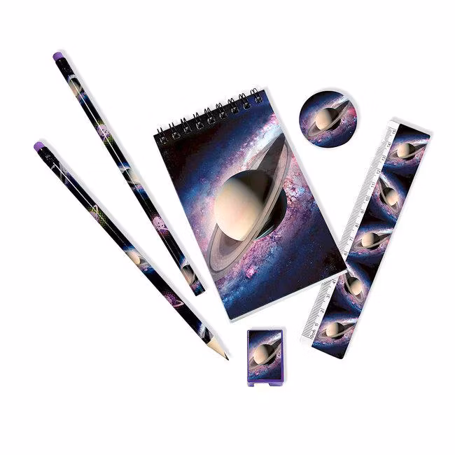 Ett skrivset med anteckningsbok, två blyertspennor, suddgummi, pennvässare, block och linjal. Skrivsetet har ett temat Rymden och alla sakerna matchar.