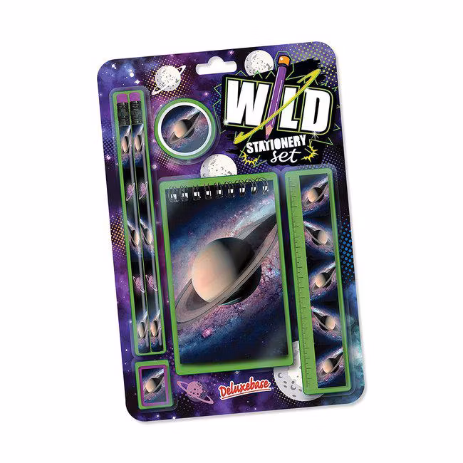 Ett skrivset med anteckningsbok, två blyertspennor, suddgummi, pennvässare, block och linjal. Skrivsetet har ett temat Rymden och alla sakerna har matchande bilder och mönster.