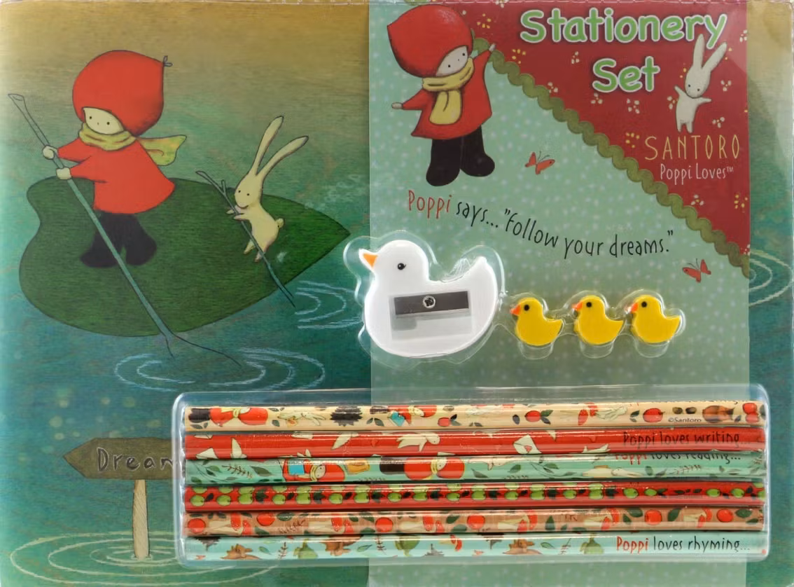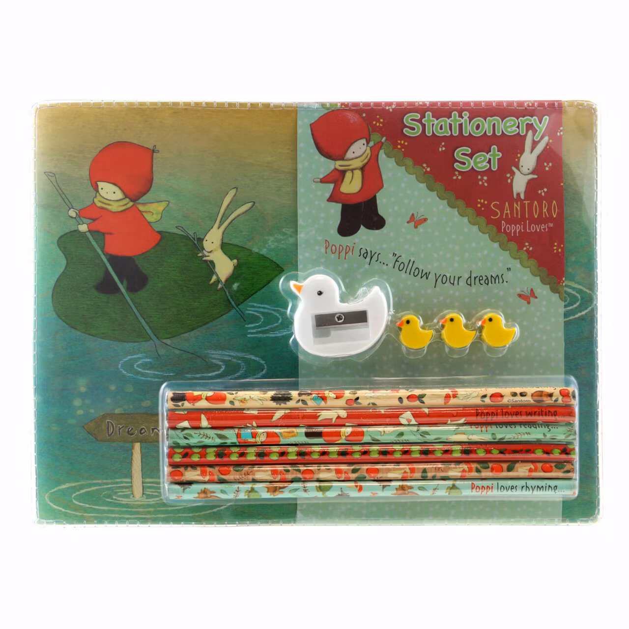 Här finns ett fint set med tre sudd, 6 pennor, pennvässare och en anteckningsbok med 60 sidor. Allt har härliga illustrationer från serien Poppi Loves.