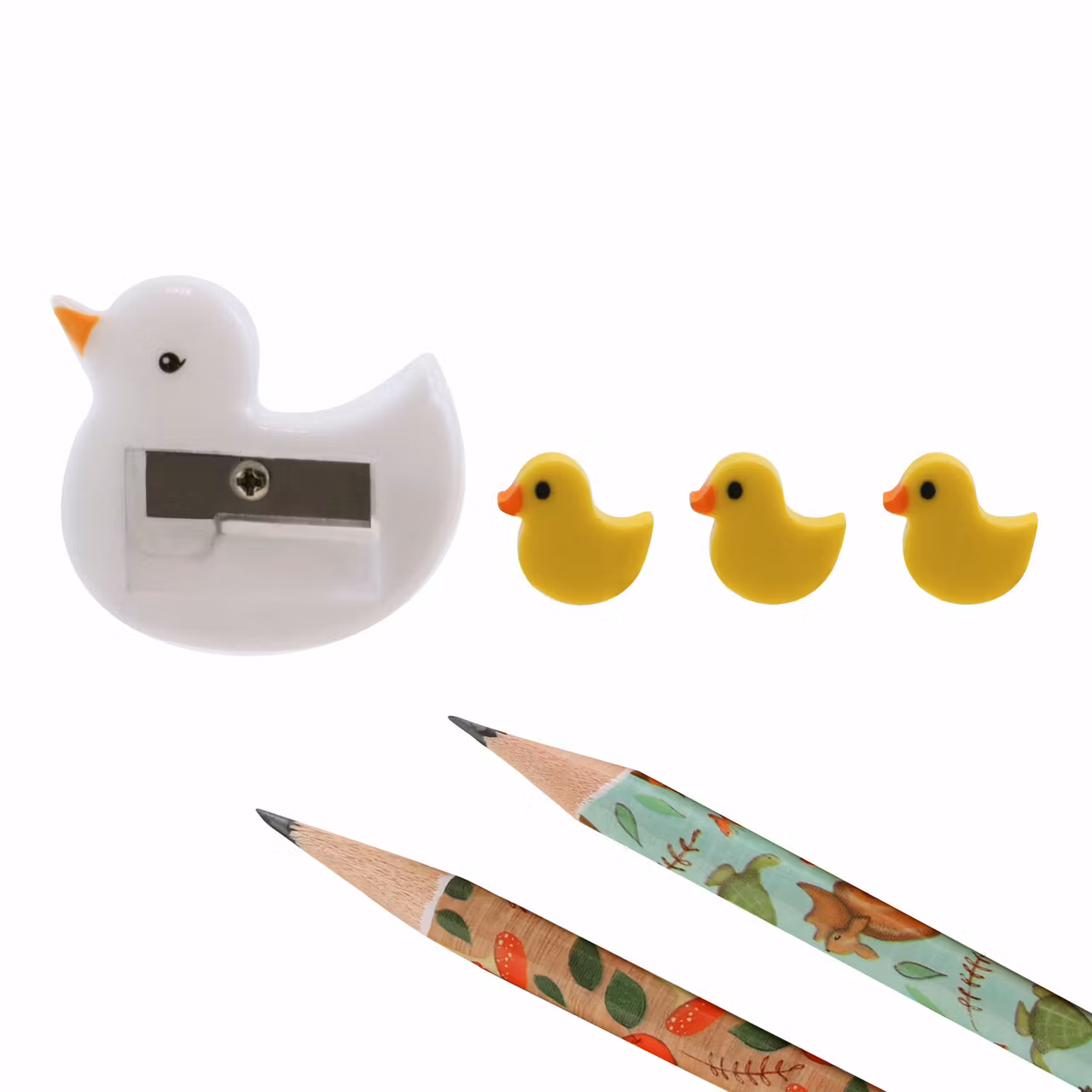 Här finns ett fint set med tre sudd, 6 pennor, pennvässare och en anteckningsbok med 60 sidor.