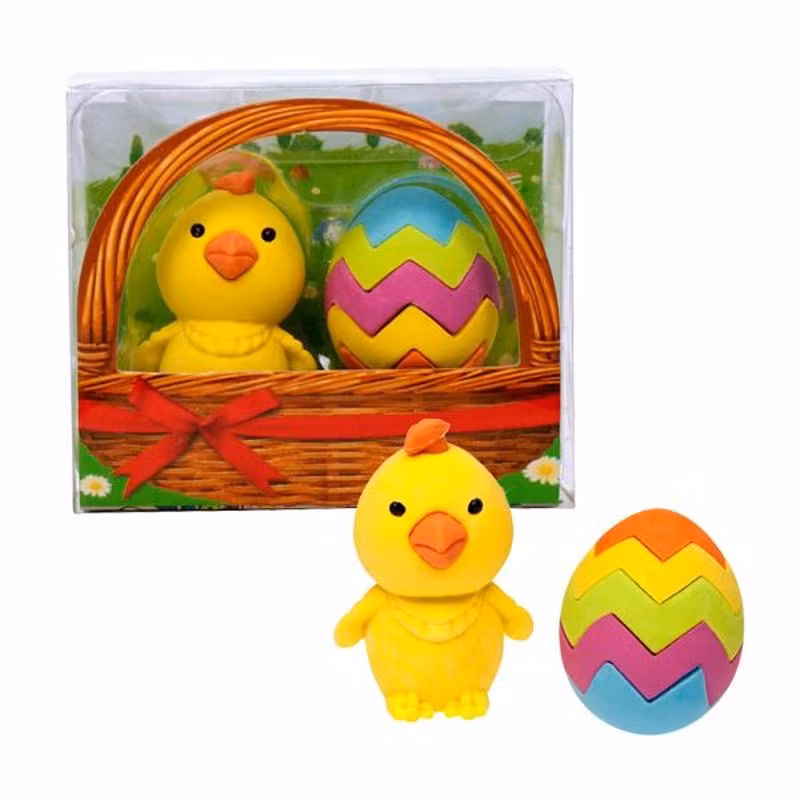 Roliga suddgummin i form av en söt kyckling tillsammans med ett färgglatt påskägg.