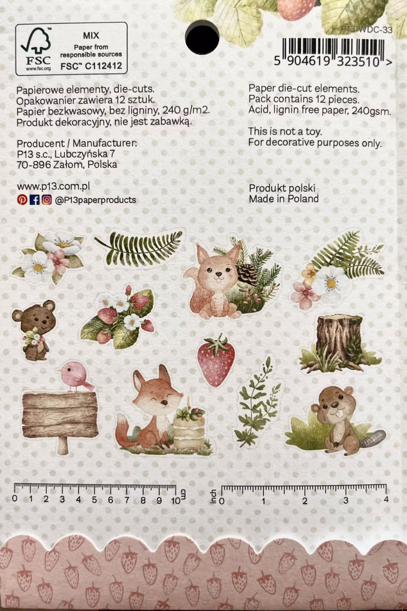 Temat är skogens vänner och i förpackningen finns 12 små söta dekorationer.
