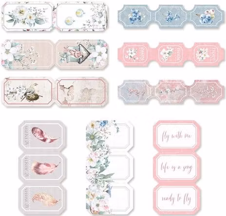 Här finns fina små biljettformade pappersdetaljer med fågelmotiv.