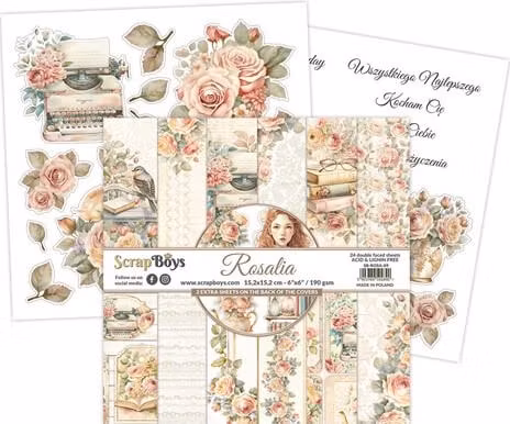På insidan av omslaget finns olika element inom temat rosor som du kan klippa ut och använda, utan att du förstör något av de andra pappren.