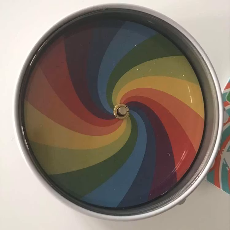 En liten burk med geometriska mönster. Dra igång snurren med den lilla spaken på sidan och låt dig hypnotiseras av spiralens rörelse.