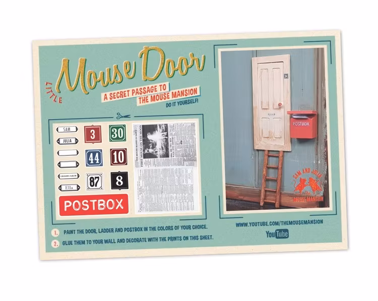 Underbar liten dörr med tillhörande stege och brevlåda. Allt är av trä och du målar dem själv i de färger som du tycker blir fint. Det medföljer även två bilder på möss. Kanske vill du sätta bilden innanför dörren så att du försiktigt kan glänta på dörren och se vad som händer i sagomössens magiska värld?