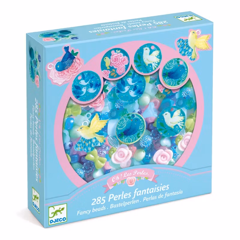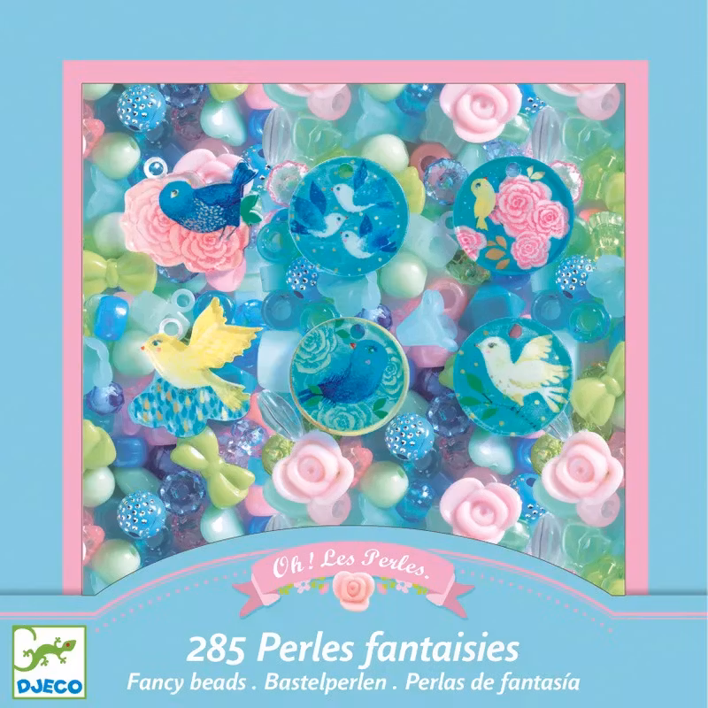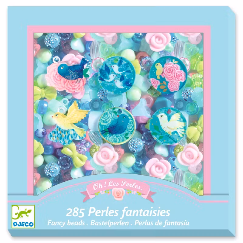 Ett set med hela 285 akrylpärlor i olika former, genomskinlighet och färger, 6 st vackra hängen i akryl med fåglar som motiv samt 6 meter elastisk tråd. I detta set är det mest blå, turkos, gröna och rosa nyanser med en del extra glittrande, facetterade, kul utformade eller skimrande pärlor. Pärlorna och de fina färgerna har valts ut för att passa ihop och för att du ska få ett vackert resultat varje gång, oavsett hur delarna kombinerats.