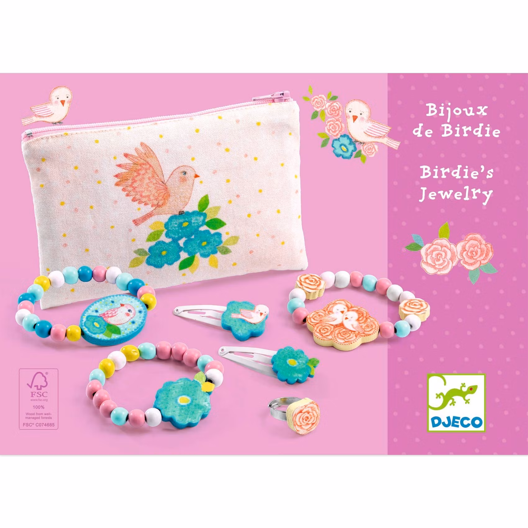 Ett fint smyckesset i trä med matchande hårdekorationer samt en söt liten necessär dekorerad med en söt fågel. Detta set har blommor och fåglar som tema och i setet ingår tre elastiska armband med olika dekorationer, en justerbar ring och två hårspännen samt en necessär av bomull som stängs med en dragkedja. Delarna av trä är tillverkade av FSC®️ certifierat trä.