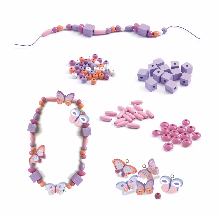 Härligt pärlset tillverkat i trä. Med runt 450 pärlor räcker detta set till flera armband och halsband. Färgerna går i lila och rosa. Temat är fjärilar och berlockerna är bedårande söta.