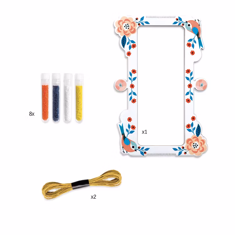 I setet ingår: en vävram där det går att hålla på med två armband samtidigt, 8 rör med pärlor i olika färger, 2 förpackningar med gulfärgad tråd att spänna upp och väva med samt några pärlnålar.