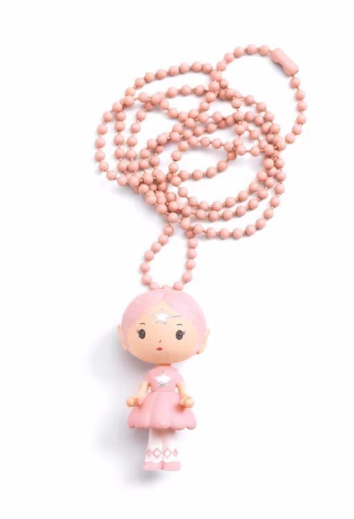 Bedårande halsband med ett stjärnbestrött litet väsen som hänge. Kedjan är rosa och den lilla figuren i rosa, vita och silvriga färger. Ge den här lilla stjärnan till en annan liten stjärna att bära om halsen!
