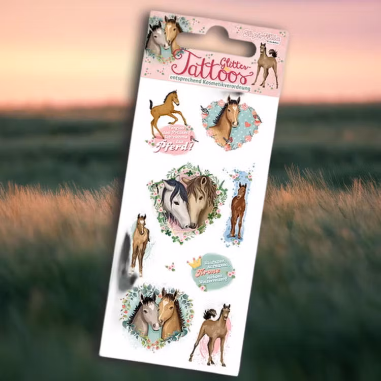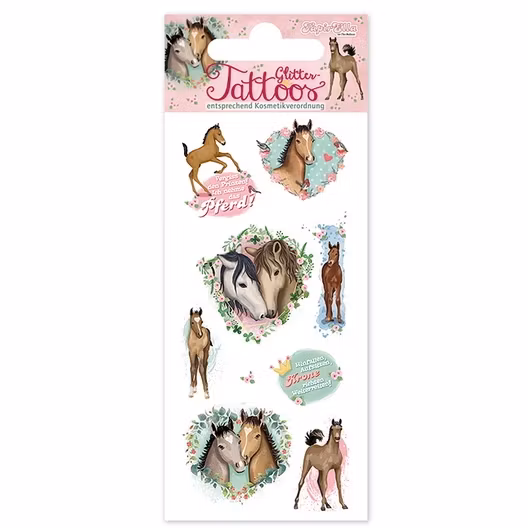 Om du älskar glitter och hästar är det här tatueringarna för dig! Här finns 9 fina tatueringar som passar fint på en hand eller en arm på någon som älskar små söta föl. Alla tatueringarna är indränkta i glitter. Hur mycket lyxigare kan det bli?