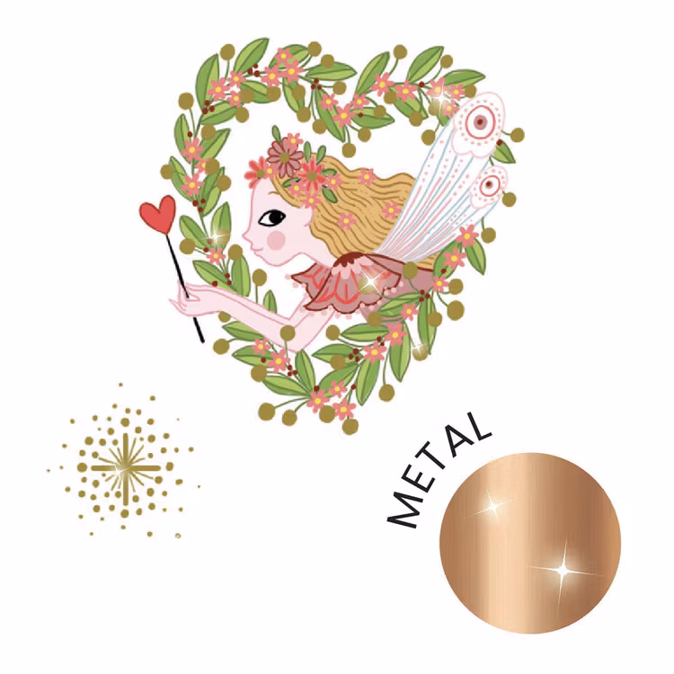En samling vackra tillfälliga tatueringar med färgglada feer, djur och blommor med vissa detaljer förhöjda med metallic-effekt. Motiven är både snygga, söta och häftiga.