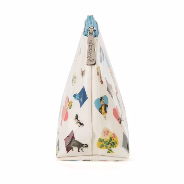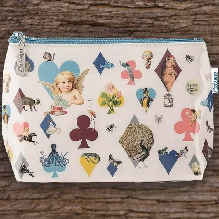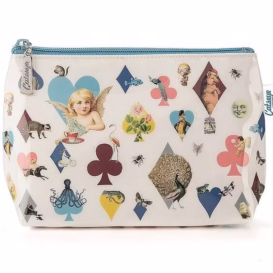 Liten, praktisk väska att använda som necessär till smink eller som en liten väska till leksaker eller något annat fint som du vill förvara väl. Underbara illustrationer med många små vintage motiv. Dragkedjan är blå.